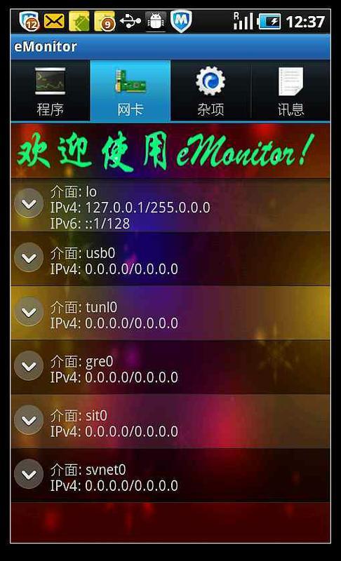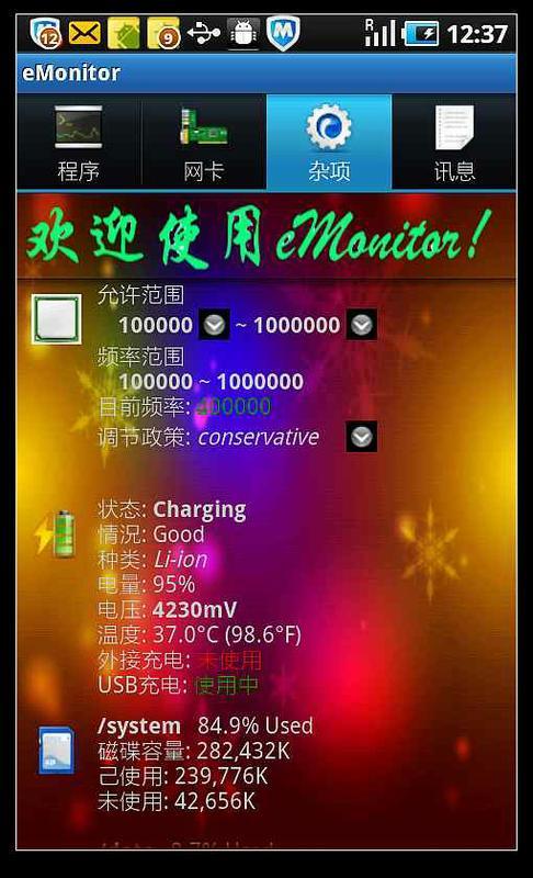 你也可以查看各个网卡的信息以及他们接受和发送的字节数,在杂项里你可以查看CPU的频率以及按不同原则调节CPU的频率,控制CPU的允许范围,你也可以查看电池的信息和手机内存、SD卡等的使用情况;