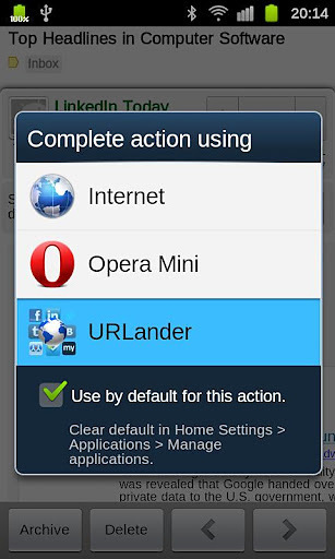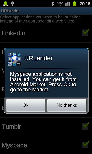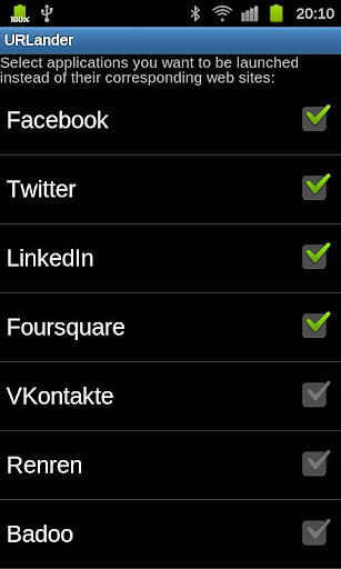 URLander allows you to open Facebook, Twitter, eBay links in native Android apps When you got an email from Facebook or other social network site, all the included links are open in browser, even if you have native Android apps installed.URLander fixes that.Say, when you click on www.facebook.com link, URLander allows you to open it in browser or launch Facebook app instead. The same with Twitter, LinkedIn, Foursquare, eBay, PayPal, Myspace, Tumblr, and other popular web services! Please, send me email if your favorite social network is not on the list. I will add it in future version.
