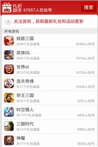 礼包助手可以为您提供最新最全的各类手游礼包、道具、激活码、游戏活动等,您也可以通过关注你玩的游戏,第一时间获取你想要的游戏礼包、活动信息,自从用了礼包助手,妈妈再也不用担心我抢不到礼包。