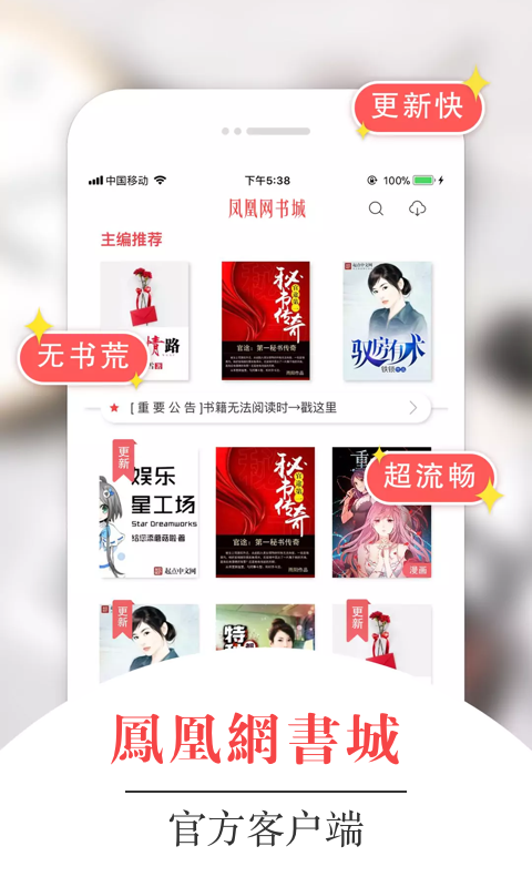 凤凰网书城官方客户端,小说阅读神器,引领阅读新潮流! 新用户注册限时福利!海量小说,任您畅读!连载小说,实时更新!书荒从此说再见!即刻下载,享受飞一般阅读体验。