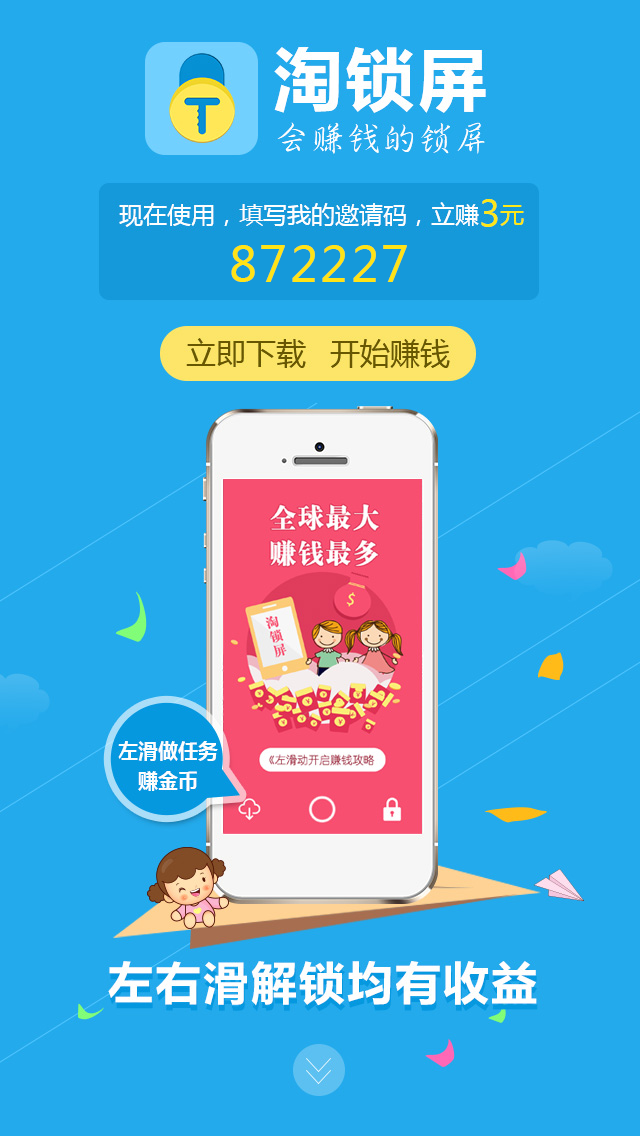 淘锁屏是一款新型的移动锁屏赚钱神器!划开手机,分分钟有钱进账,内含精美壁纸、无病毒、放心使用,老少皆宜,让您美美过日子,天天好心情!