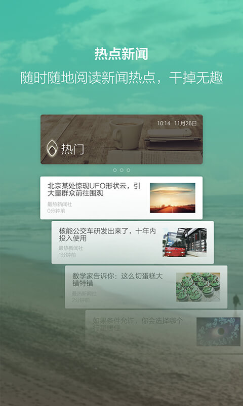 2、【向左滑动-热点新闻】 无聊无趣的时候左滑一下,热点新闻呈现在面前,从此干掉无趣!