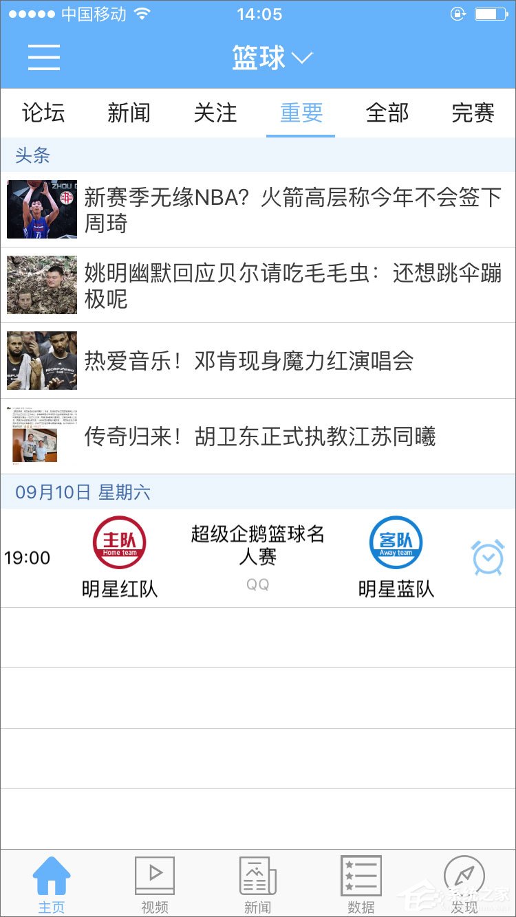 4、进入“主页”版块,用户可以选择查看最新新闻或关注球队的消息;也可查看最近的赛程;