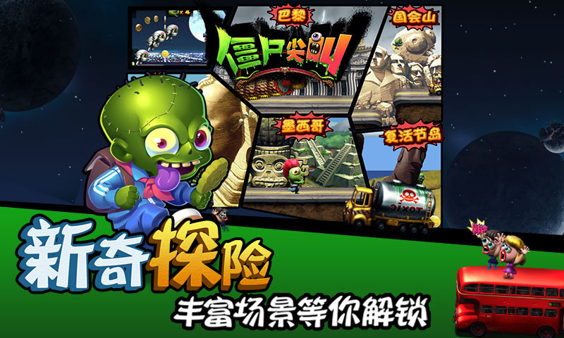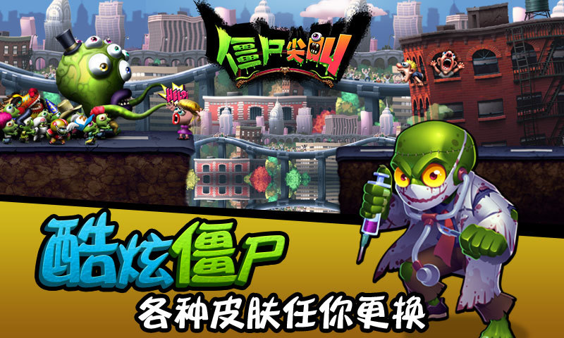 《僵尸尖叫》是一款有趣的横版跑酷游戏。加入了很多其它跑酷游戏没有的新要素,路上会有一些问号的箱子,当玩家吃到带有问号白色方块,僵尸就会进行变身得到特殊的效果,种类相当多。正式开始玩家会看到一只可爱的绿色小僵尸,玩家可以靠点击画面来进行跳跃,有分长按的大跳跃跟点击的小跳跃,要视情况来选择。在奔跑的路上会看到一些停在路上的车辆!当玩家目前的僵尸数目达到车辆上的数字时,可以推翻车辆并感染其中的幸存者。玩家会在路上看到彷徨无助的人,这时只要将他们吃掉,就可以感染他们。游戏结束的判断方式不是一开始的僵尸死亡,而是场上无僵尸!你吃越多人,越多生存机会!简单欢乐,同时还不乏难度挑战和刺激的内容,具有相当的可玩性。等公车、上班休息时或者想打发一下时间刺激一下神经的话,本作是相当合适的。感兴趣的可不要错过了。