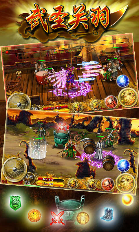 武圣关羽是一款横版动作游戏,千里走单机,华容道,怒战长沙等,8大关卡再现关羽当年经典战役,爽快的打斗,丰富的系统:装备强化系统,随机祭坛系统,场景机关系统,8大特色Boss在关底等你来战,在紧张的打斗过程中体验一款真正动作游戏的乐趣。