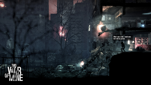 战争过后的生活是什么样的知道吗?或许这个游戏会让你懂得一些事情!在《这是我的战争》里,玩家将扮演一位父亲,与女儿在绝望与残酷的孤城里,需要想办法生存下去。玩家可以在各个场景中拿到材料道具,制作生存所需物品,有时还必须做下狠心决定与其他人生存竞争!你可以在这黑暗中活下来吗?