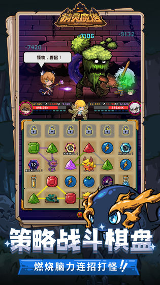 爬塔之路并不轻松,开动脑筋,策略组合多方资源能让你走得更远。战斗棋盘花样多多,合成不同颜色的宝石,为兄妹两人输送各类增益Buff。通过战斗成功解救可爱精灵,连线组合多重精灵阵型,为你提供强力助攻。