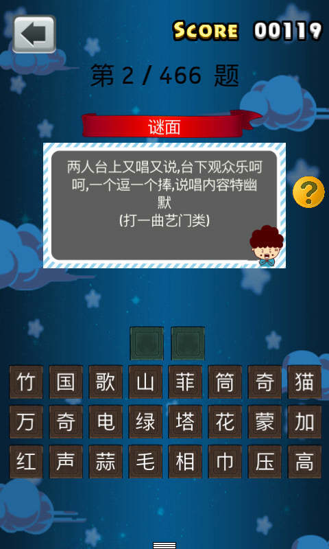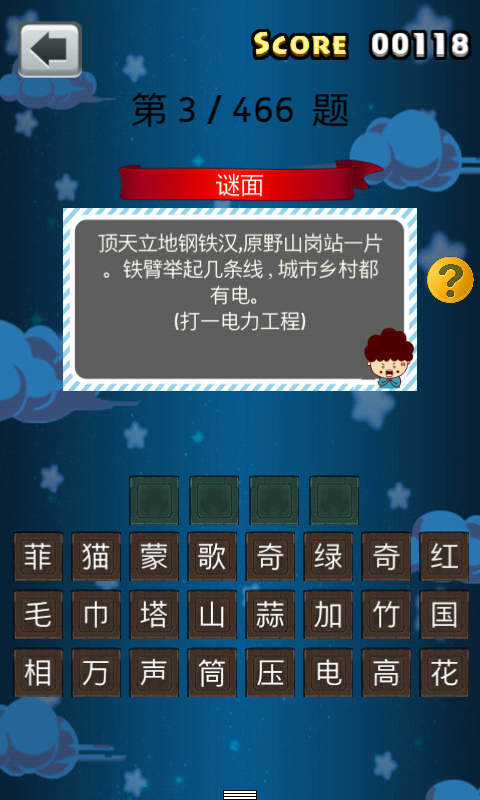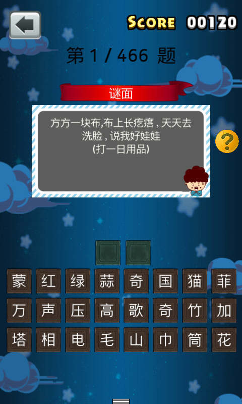 猜灯谜又称打灯谜,是中国独有的富有民族风格的一种汉族民俗文娱活动形式, 是从古代就开始流传的元宵节特色活动。 每逢农历正月十五,汉族民间都要挂起彩灯, 燃放焰火,后来有好事者把谜语写在纸条上, 贴在五光十色的彩灯上供人猜。 本游戏收录了百余条灯谜题目, 快来一起挑战开心猜灯谜游戏。