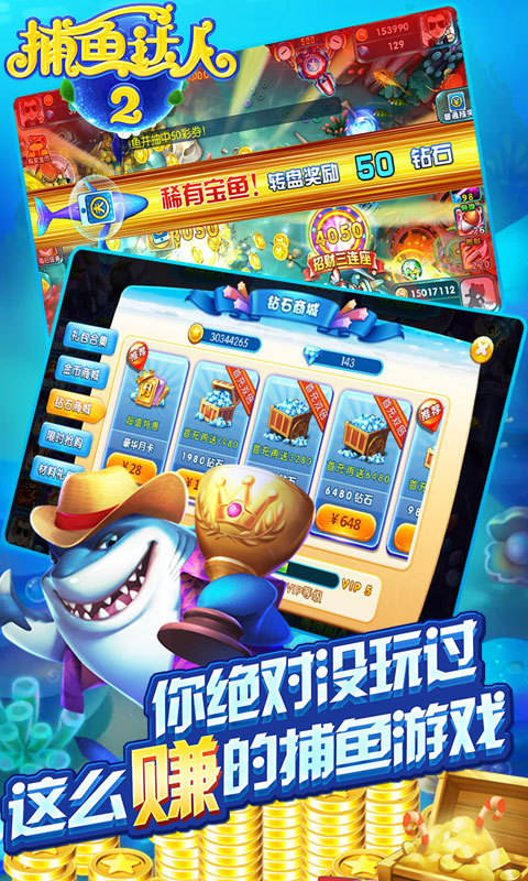 捕鱼达人2最大的亮点就是在原来捕鱼达人的基础上更新了更多的关卡。之前的捕鱼达人的关卡都是需要付费才能激活,新版《捕鱼达人2》新添多种强力武器,让你欲罢不能!12分武器回旋镖,撞到大鱼就会发生爆炸,让大虎鲸无所遁形;高级霰弹炮一次可以发射3枚炮弹,让你在鱼群来临时满载而归!最绚丽的鱼群,最新奇的玩法,还有最具吸引力的奖品,快来体验吧!