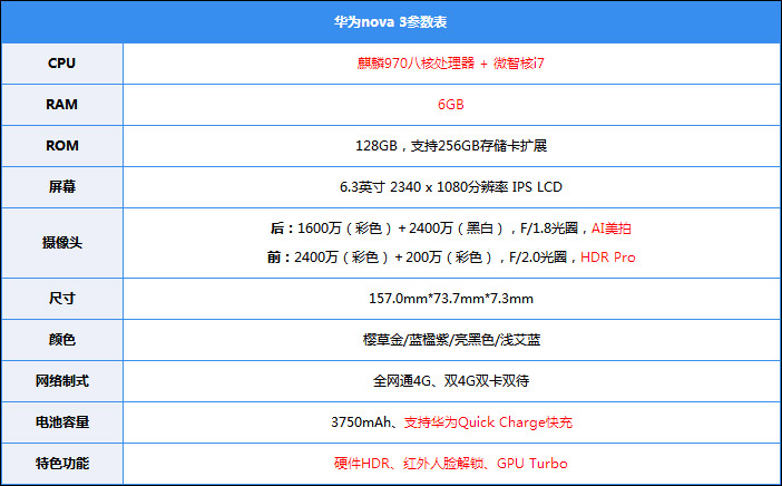 硬件参数方面,华为nova 3采用旗舰级麒麟970处理器,内置6GB运存,储存空间为128GB。电池容量3750mAh,支持华为Quick Charge充电。运行基于Android 8.1的EMUI 8.2定制系统。