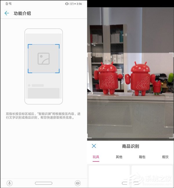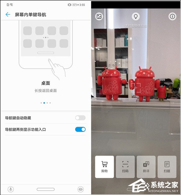 在EMUI 8.2的单键导航中,语音助手和扫一扫功能则是分别布置在内置单键的俩侧。右边的眼睛形状图标,主要功能是扫一扫,有四种扫描功能让你选择,方便快捷,左边的则是语音助手。