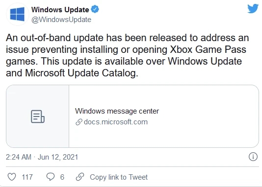 计划外更新以解决阻止安装或打开XboxGame Pass游戏的问题: