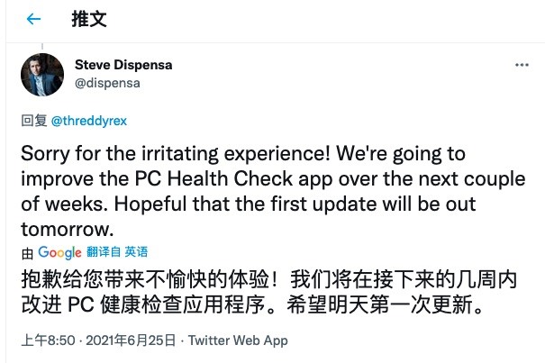 但有用户反应称他们的新电脑不知为何不满足 Win11 的升级条件,同时该工具仅提示不满足升级条件,但没有给出原因等更详细的信息,体验很不好。对此,微软终端经理 Steve Dispensa 在 Twitter 回应称,将在未来几周内改善该应用程序,首个更新预计明天推出。