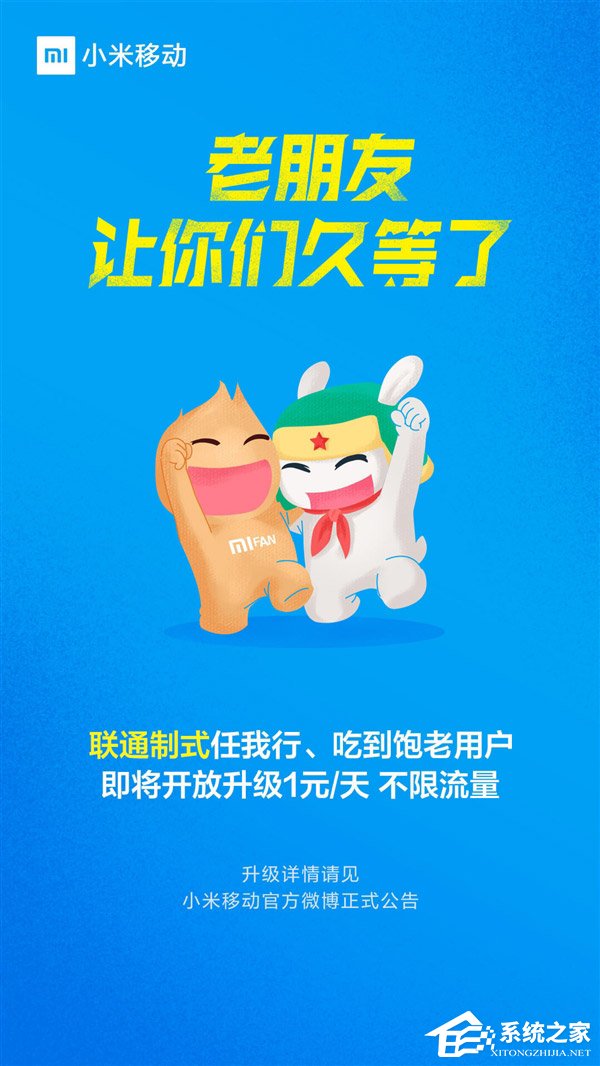 据悉,小米移动在官方微博中发文称,“联通制式任我行、吃到饱老用户即将开放升级1元/天 不限流量(开放升级时间请见后续正式公告)”。