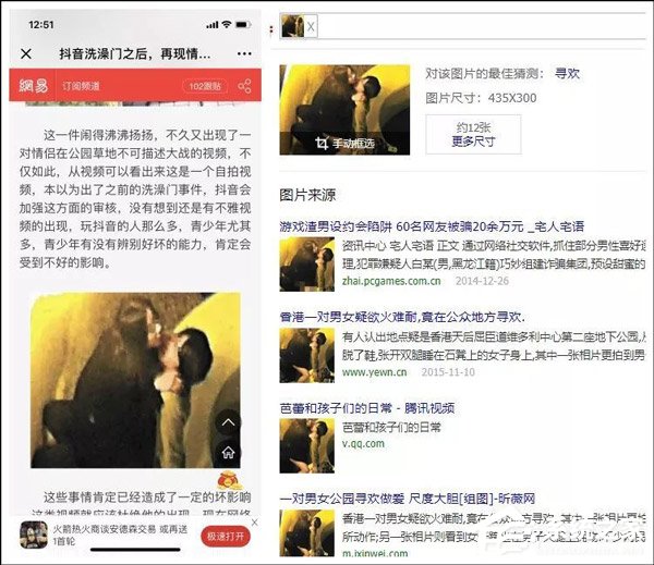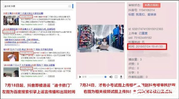 谣言所指称的视频,从未在抖音上出现。类如“迪卡侬门”,污蔑抖音的稿件发布之后,才有人试图向抖音上传相关不雅视频内容;“四岁女儿残疾门”,则直接把见义勇为的历史新闻图片打上马赛克,称是父亲在拍抖音时将女儿摔残疾;“公园门”,将网络流传图片污蔑为抖音的视频截图,不一而足。