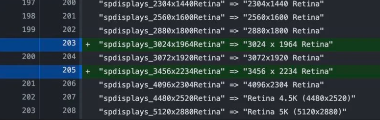 据 MacRumors 报道,这两种新的显示器分辨率分别为“3456 x 2234 Retina”和“3024 x 1964 Retina”,与当前所有的苹果 Mac 产品的内置显示器分辨率都不一致。