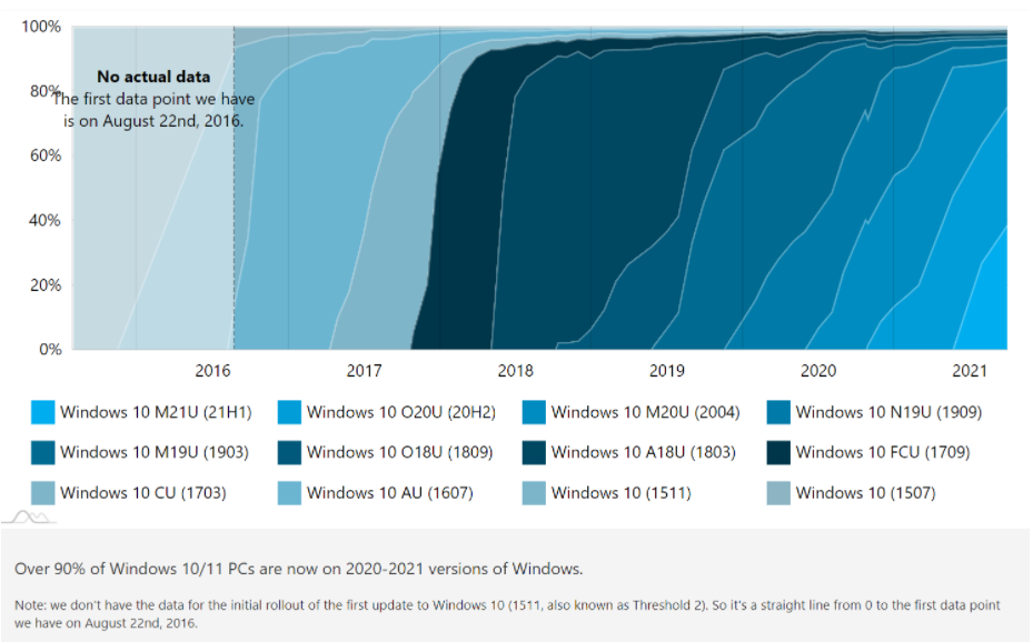紧随其后的是 Windows 10 20H2 更新,市场份额为 36.1%。20H2 之后是 2020 年 5 月 10 日的 Windows 更新,该更新目前在 14.5% 的 Windows 10 PC 上运行。另一方面,Windows 10 1909 声称拥有 4.3% 的使用份额,而 Windows 10 1903 声称拥有 2.1% 的市场份额。