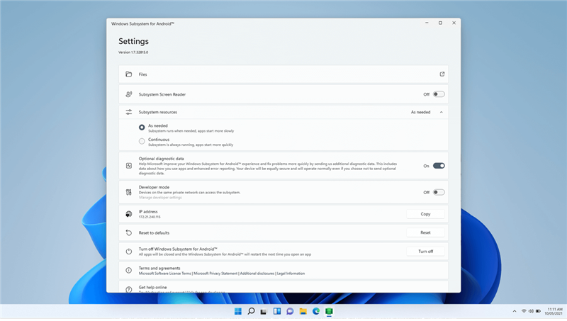 要访问适用于 Android 设置的 Windows 子系统应用程序,请转到:开始 》 所有应用程序 》 适用于 Android™️ 的 Windows 子系统。设置应用程序可用于调整以下设置: