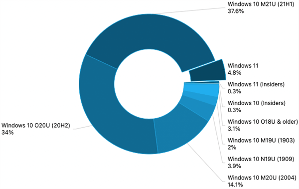 Windows11安装率激增 已在超过5%受访PC上运行,微软正式发布Windows 11已经快一个月了,新的操作系统已经在AdDuplex十月份调查的PC上运行了超过5%。更准确地说,在该公司调查的6万台电脑中,有4.8%运行的是Windows 11的生产版本,有0.3%的用户还在运行Windows 11的内测版本。