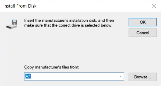 在 Windows 10 或更早版本中,当您浏览“从磁盘安装”等菜单时,设备管理器的默认位置设置为 A:\。
