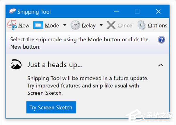 微软将在不久的将来移除老的截图工具,改为主推Screen Sketch(WIN + Shift + S),现在用老工具将看到提示。