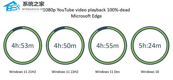 在浏览器测试中,使用 Edge 浏览器播放 1080p YouTube 视频,显示 Windows 10 的续航比 Windows 11 长 30 分钟左右。取得最好成绩的依旧是Win10 21H2,有5小时24分钟之多。