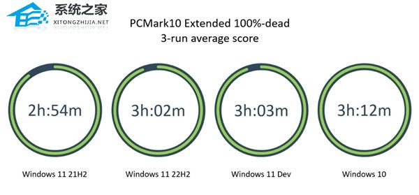 测试结果显示,Windows 11 21H2 续航最差,Windows 10 的续航最好。