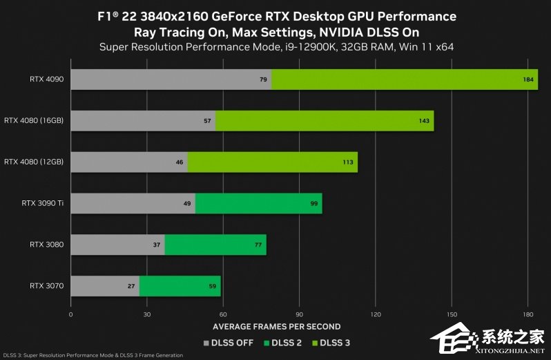 在《F1 22》4K 最高画质,开启光追和 DLSS 3 的设置下,RTX 4090 可达 184fps,RTX 4080 16G 可达 143fps,RTX 4080 12G 可达 113fps。