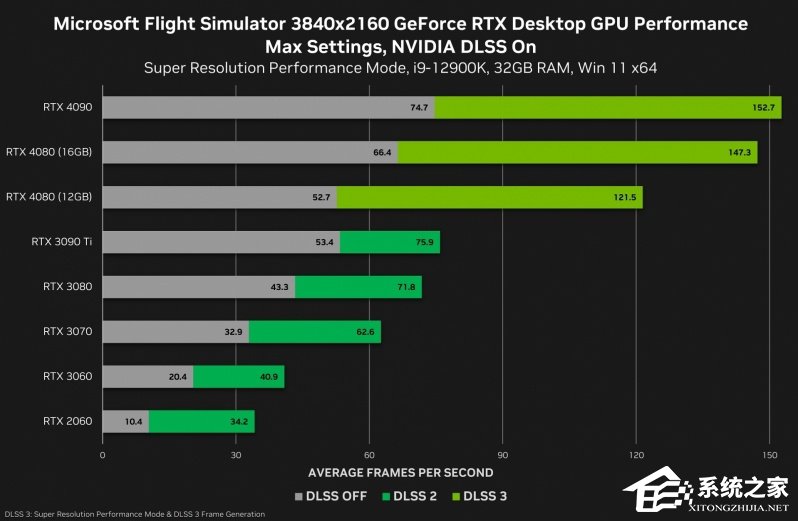 在《微软飞行模拟》4K 最高画质 DLSS 3 开启后,RTX 4090 帧数可达 152.7fps,RTX 4080 16G 可达 147.3fps,RTX 4080 12G 可达 121.5fps。