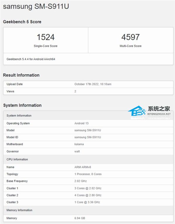 跑分信息显示,该机搭载8核CPU,超大核主频提高到了3.36GHz,4大核主频为2.80GHz,3小核为2.02GHz。作为对比,骁龙8+Gen1的CPU为超大核3.2GHz,3大核2.75GHz,4小核2.0GHz。