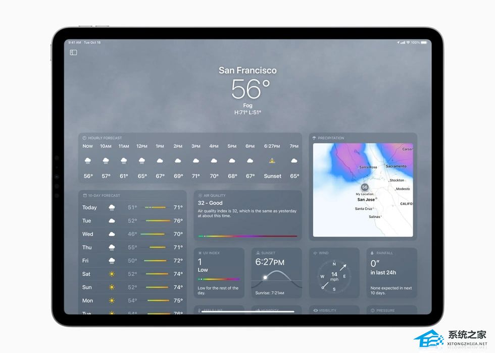 为全面利用精美屏幕量身打造,天气 App 为 iPad 带来沉浸式动画、细节丰富的地图和可轻点互动的天气预报模块。只需轻轻一点,用户就可查看最关键的天气信息,也可以通过其中的地图来查看降水、空气质量和温度。用户会在所在地区发出恶劣天气警报时收到通知,也可以通过颜色编码来查看空气质量等级。