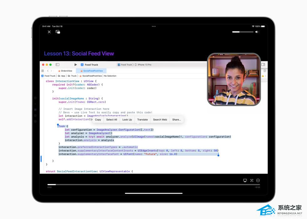 利用设备端智能技术,实况文本可识别系统内图像中的文本,该功能现可应用到视频中,暂停的视频画面中的文本也可实现互动。轻点视频画面,即可快捷实现拷贝粘贴、翻译外语或换算货币。
