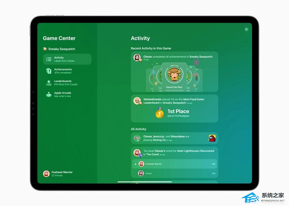 Game Center 的面板通过重新设计,使用户能够轻松地与朋友一起游戏或者竞争,直观显示朋友的游戏活动和成就。