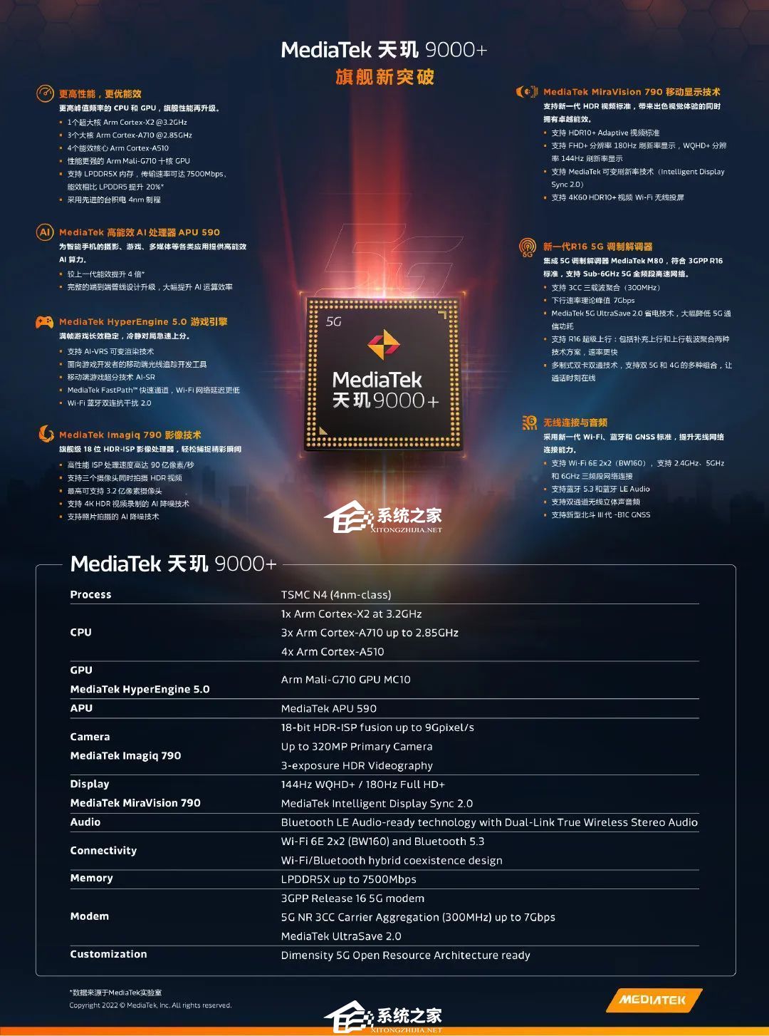 天玑9000+拥有更高性能,更优能效,更高峰值频率的CPU和GPU,旗舰性能再升级。配置1 个超大核Arm Cortex-X2 @3.2GHz、3 个大核Arm Cortex-A710 @2.85GHz、4 个能效核心Arm Cortex-A510,此外还采用性能更强的Arm Mali-G710 十核CPU,支持LPDDR5X内存,传给速率可达7500Mbps.能效相比 LPDDRS捉升20%。