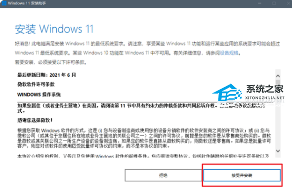 2、下载windows 11安装助手后,会得到一个“Windows11InstallationAssistant.exe”文件,双击打开来,点击“接受并安装”。