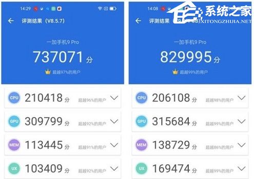 3、再看一下骁龙888的一加9pro,同样对比v9版安兔兔跑分。(右图)