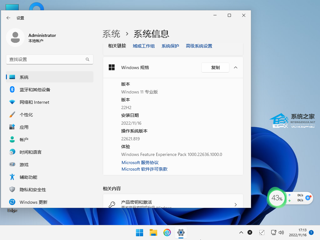 Ghost Win11 22621.819官方正式版 (22H2)是由KB5019980补丁升级而来的版本,采用微软最新 Windows 11 22H2 22621.819 64位 专业版为基础进行简单优化,保持原版原汁原味,全程离线制作,100%隔离病毒木马,支持SSD固态硬盘的4K对齐,免激活,所有高危漏洞已经全部安装,建议使用系统之家装机大师U盘工具安装或硬盘安装。