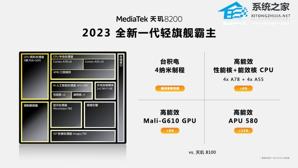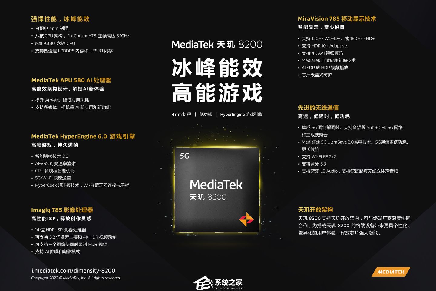 据系统之家小编12月8日最新消息,联发科已于上午正式发布的了新一点次旗舰芯片天玑8200,该处理器是天玑8100升级版,而且无论在工艺、CPU 频率、APU、GPU都有着全面提升,号称冰峰能效释放高能游戏体验。