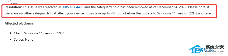 系统之家了解到,在 Windows 健康仪表板更新中写道:“此问题已在 KB5020044 中得到解决,并且自 2022 年 12 月 14 日起已取消保护措施。请注意,如果你的设备没有其它方面的升级限制,那么在未来 48 小时之内会收到 Windows 11 Version 22H2 更新”。