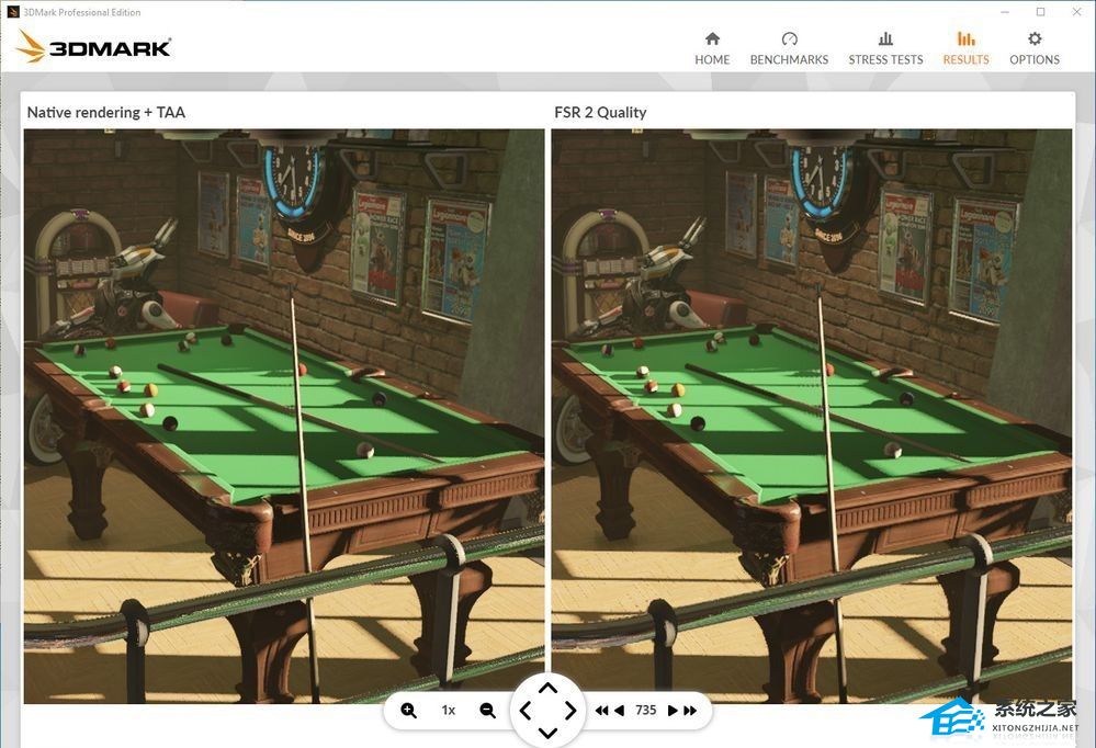 3DMark 的 AMD FSR 功能测试还包括一个内置的帧检查工具,可通过一个交互式的并行比较来对比 AMD FSR 2 技术和使用了 TAA 的原生渲染的图像质量。