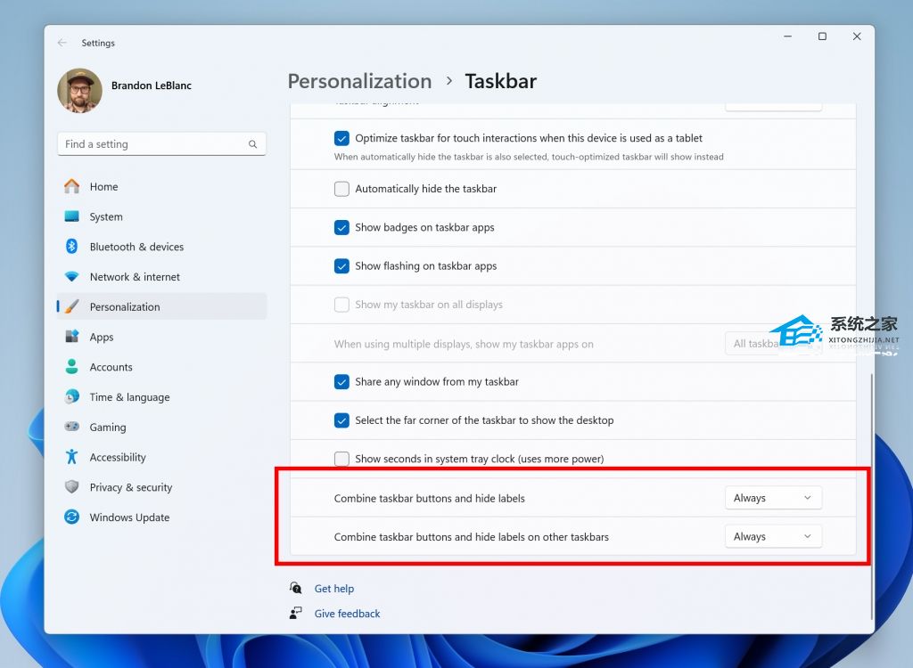 为了更轻松地在任务栏上启用永不组合模式,我们更新了设置。您可以通过简单地将“组合任务栏按钮和隐藏标签”调整为“从不”来打开从不组合模式。我们提供了一个单独的设置来为其他任务栏(例如多个监视器场景)打开此功能。