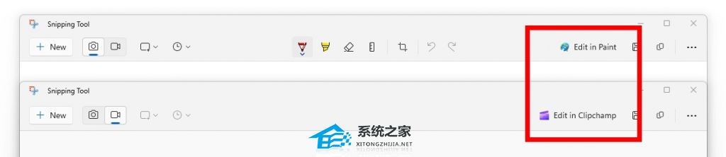 截图工具中的新按钮,用于在 Paint 中编辑屏幕剪辑以及在 Clipchamp 中编辑屏幕录制。