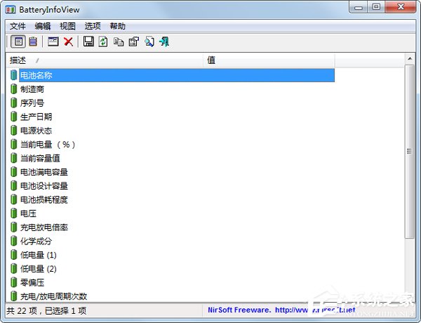 笔记本电池检测软件(BatteryInfoView)可全方位查看笔记本电池的状态,软件为汉化版本,方便使用,目前的电池容量,完全充电容量,电压,充电/放电率等功能,绝对比本本自带的电池管理程序给力。