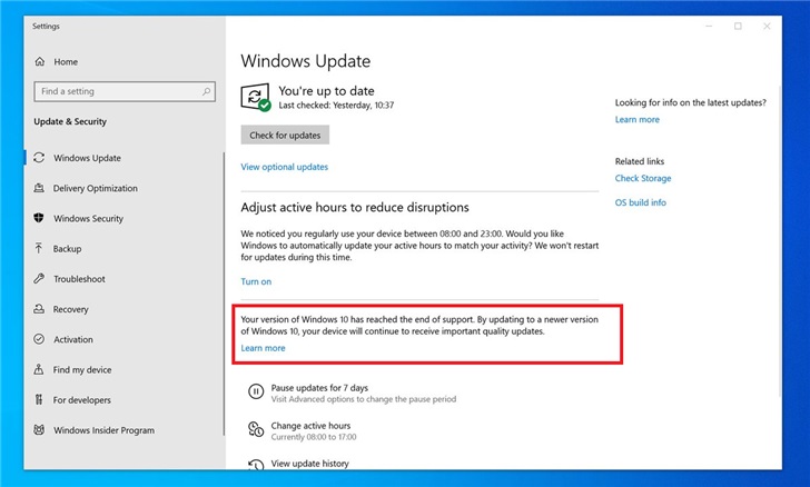 如图所示,系统Update页面上的小横幅显示为,“你的Win10版本已终止支持。通过更新到Win10的较新版本,你的设备将继续收到重要的质量更新。”