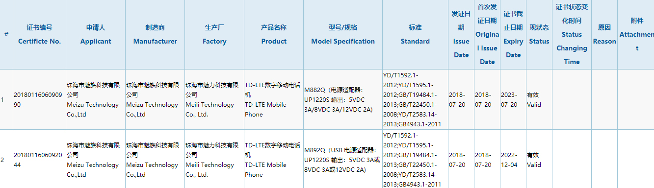据悉,这两款魅族新机型号分别是M882Q、M892Q,都配备了魅族15同款UP1220S快充头,支持最高24W快充。