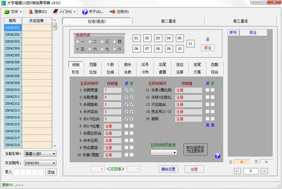 大亨福建11选5高级算号器是一款彩票算号器软件,操作简单,共17项预测指标,如胆码、杀号、和尾、热出号码等,可以帮助你们更好的选择有几率中奖的号码,帮助你们把那些没用的号码都通通排除掉,让用户可以更精准进行挑选号码。