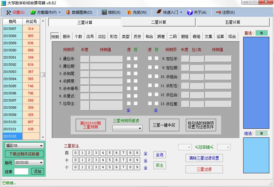 大亨数字彩综合算号器是一款适用于3D、排列三、排列5、时时乐、重庆时时彩、江西时时彩等多个彩种的算号器软件,能够自动产生17项预测指标,可进行二码三码五码投注的过滤筛选,程序能提供基本的预测指标,也能自动产生大底,用户可参考预测值,在大底的基础上进一步快速过滤得到最终结果,同时提供详细的分类数据图表供用户查阅。
