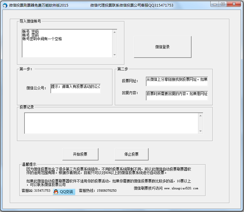 微信投票刷票器绿色版是一款专门为微信活动开发的软件,该软件界面及其操作都非常简单,内置了一百多万的微信帐号,同时还可以自己导入大量微信帐号自动投票,是一个免费的最新版本的对付手机微信投票系统,是微信朋友圈自动投票的通用微信投票刷票微信公众平台神器。