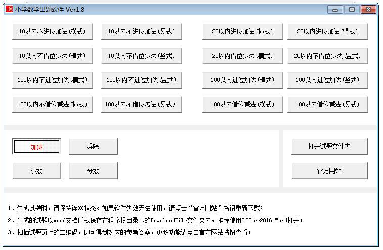 小学数学出题软件是一款可以帮助老师、家长进行小数数学出题的工具,软件针对小学数学特点开发,出题内容依据小学数学课程并按照难易程度做了分类设计,其中试题覆盖了加法、减法、乘法以及除法以及四则混合运算。