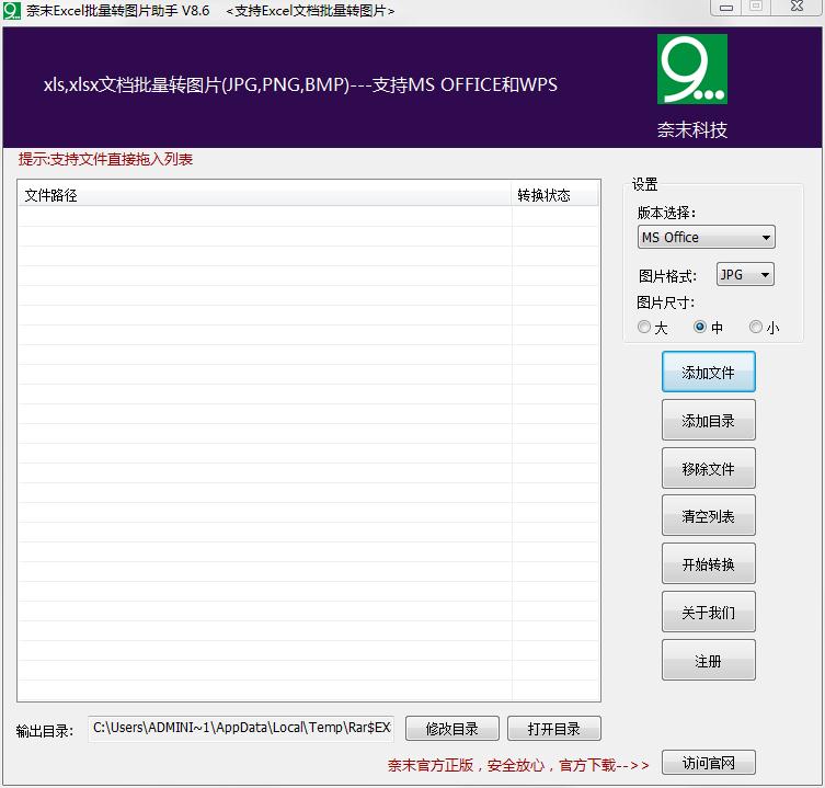 奈末Excel批量转图片助手是一款Excel转换工具,能一次性将多个Excel文档(*.xls,*.xlsx)转换为图像文件,包括 PNG, JPG, BMP等图像格式文件,转换的图片质量高,保留页眉、页脚、表格和图片等一切元素,所见即所得,无失真,转换后自动为每个Excel文件生成同名目录。